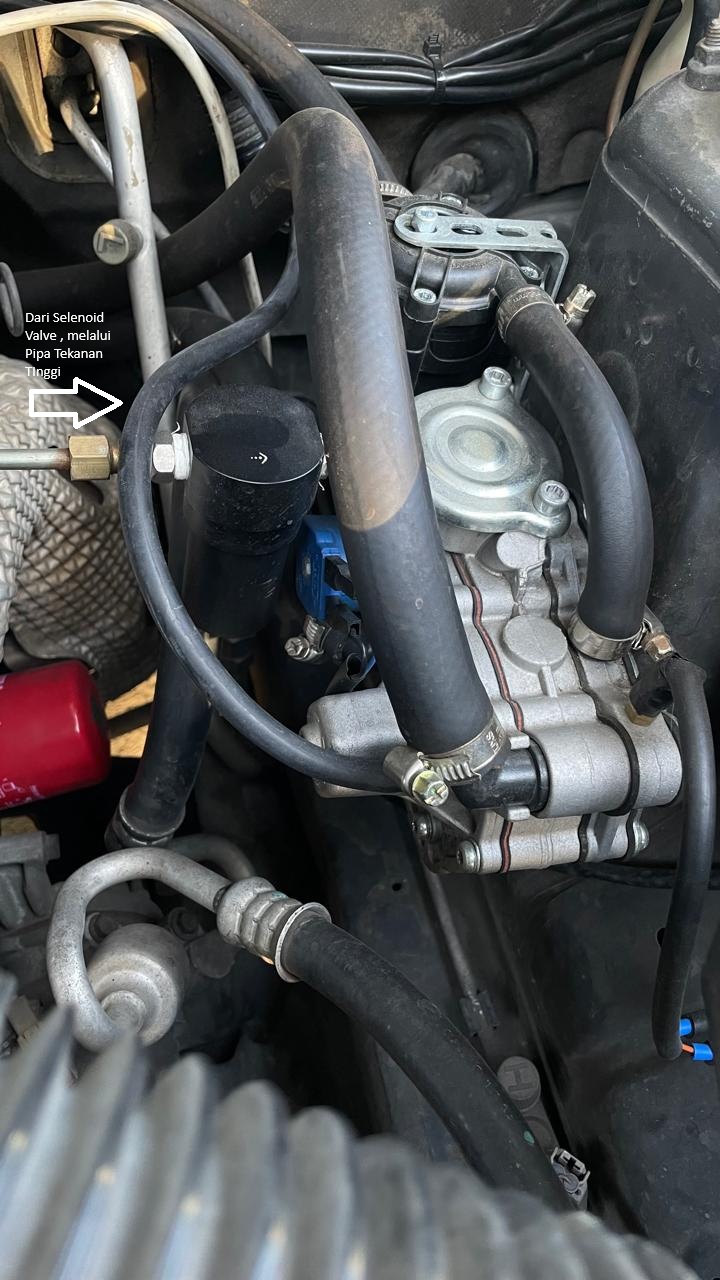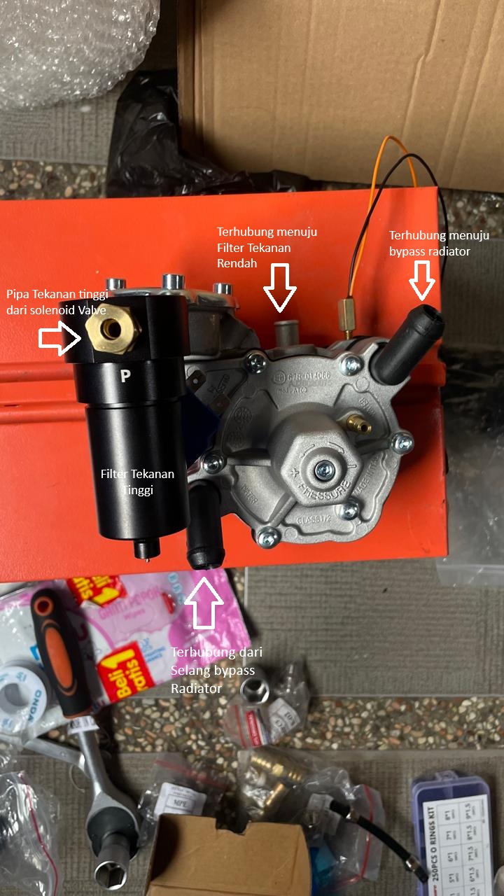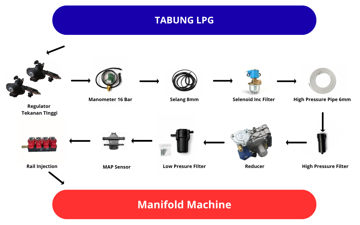 Dari Reducer → filter tekanan rendah → MAP Sensor → injector rail